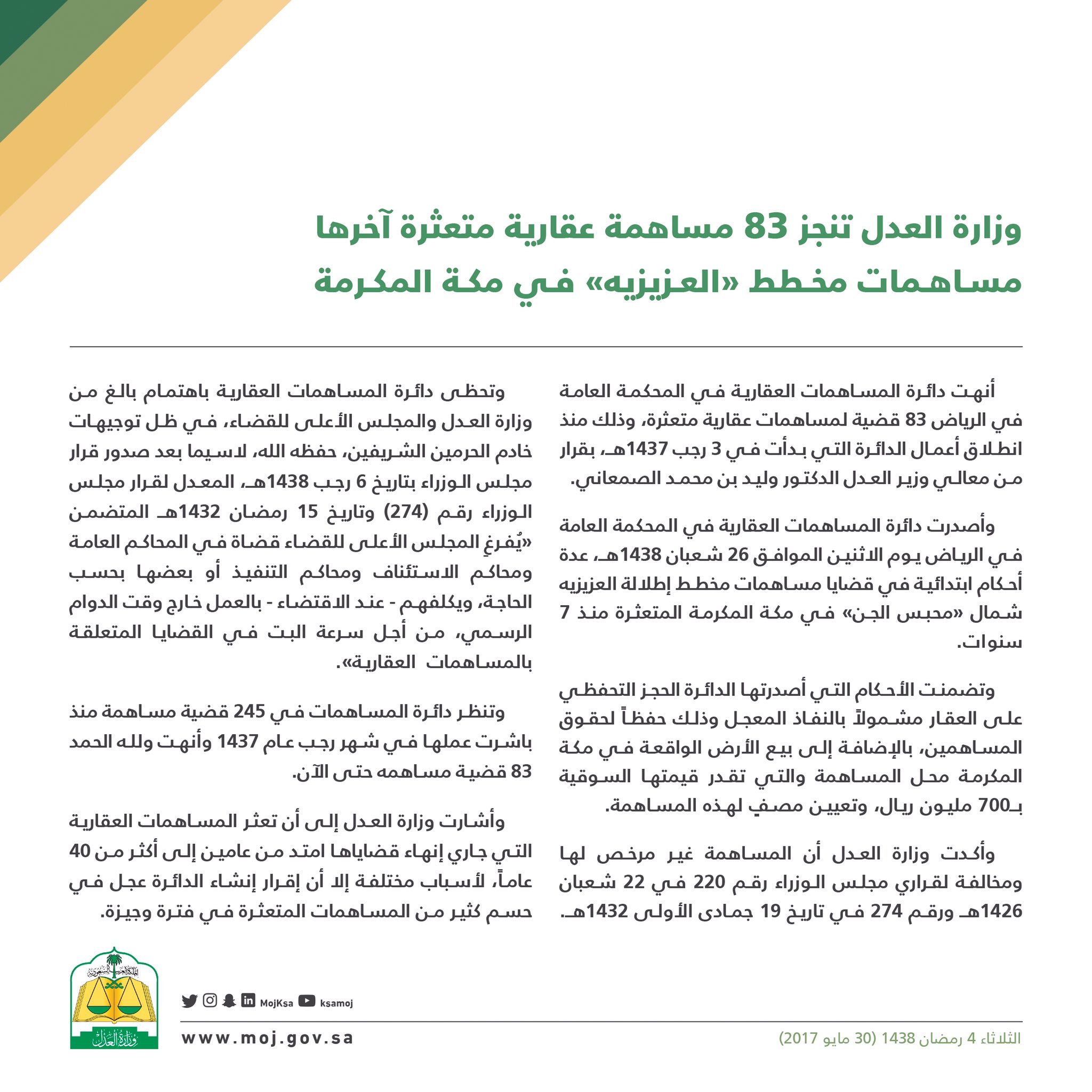 وزارة العدل Sur Twitter وزارة العدل تنجز 83 مساهمة عقارية متعثرة آخرها مساهمات مخـطط العـزيزيه فـي مكة المكرمة