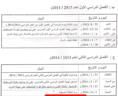 التقويم الدراسى لعام 2013 2014 فى الكويت