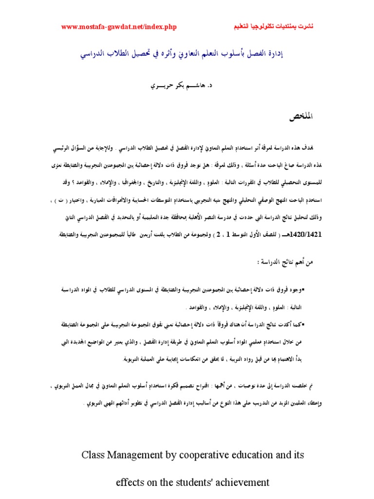 إدارة الفصل بأسلوب التعلم التعاوني وأثره في تحصيل الطلاب الدراسي