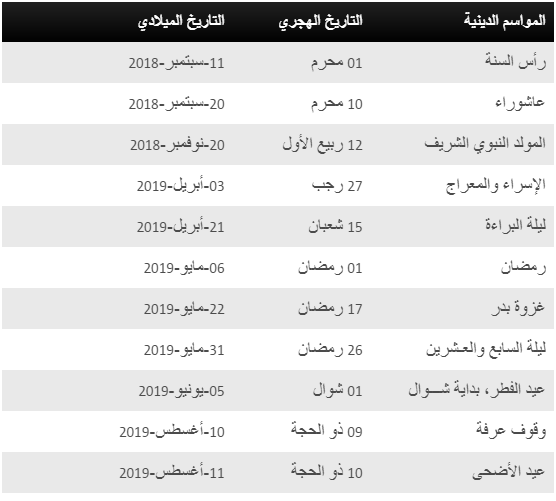 تاريخ التقويم الهجري 1440 والميلادي 2018 موعد المولد النبوي التقويم الإسلامي مواعيد المواسم الدينية خلال هذا العام في الدول العربية