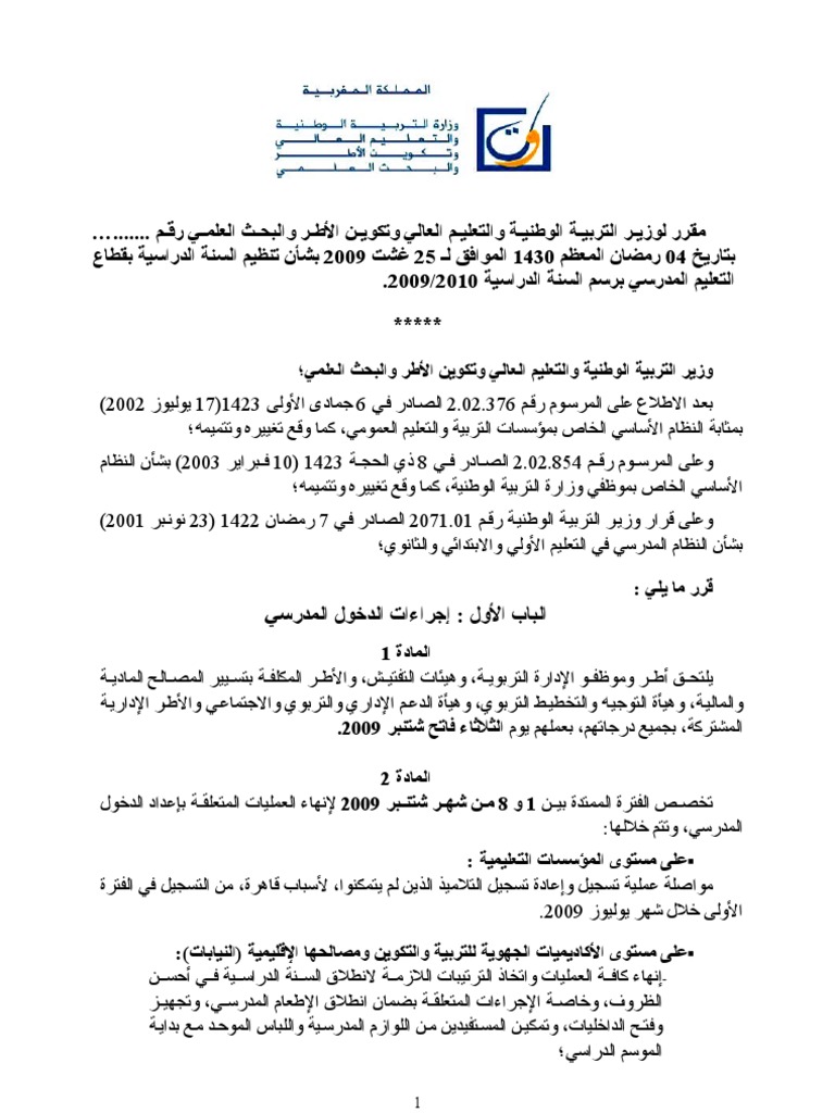 المقرر الوزاري الخاص بتهييء الدخول المدرسي 2009 2010