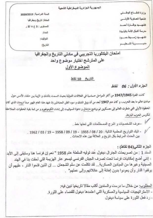 بكالوريا تجريبي أشبال الأمة 2020 في مادة التاريخ والجغرافيا شعبة علوم تجريبية ورياضيات مدونة حلمنا العربي