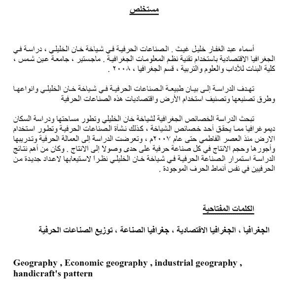 الصناعات الحرفية في شياخة خان الخليلي دراسة في الجغرافيا الاقتصادية باستخدام تقنية نظم المعلومات الجغرافية