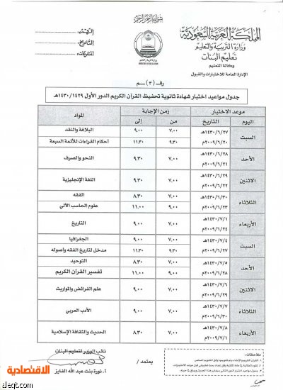 جداول اختبارات الثانوية العامة للدور الأول لعام 1430 1431هـ المصدر السعودي