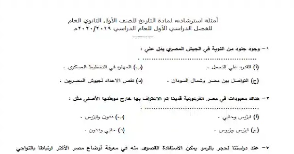 نموذج امتحان التاريخ للصف الأول الثانوي نصف العام 2019 2020 نماذج الوزارة الاسترشادية صباح مصر