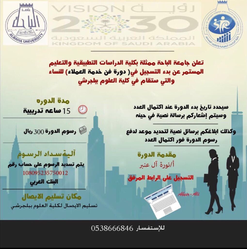 جامعة الباحة On Twitter تعلن جامعة الباحة ممثلة بكلية الدراسات التطبيقية والتعليم المستمر عن بدء التسجيل في دورة فن خدمة العملاء للنساء Https T Co Cd7tmwa749 Https T Co Nrnjtgbnpl