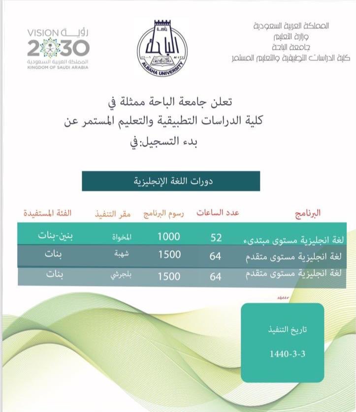 جامعة الباحة V Twitter إعلان تعلن كلية الدراسات التطبيقية والتعليم المستمر بـ جامعة الباحة عن تنفيذ عدد من الدورات التدريبية للغة الإنجليزية للتسجيل Https T Co Ijvddrvvlj Https T Co Dz6swyrbfx