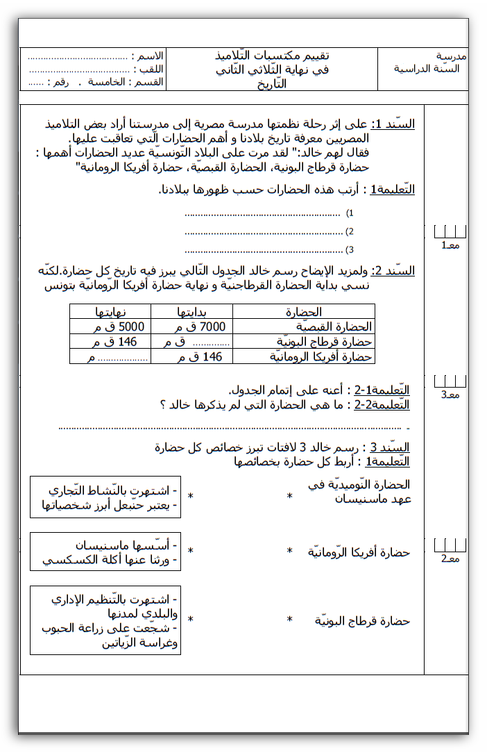 تقييم في مادة التاريخ السنة الخامسة الثلاثي الثالث مدرستنا